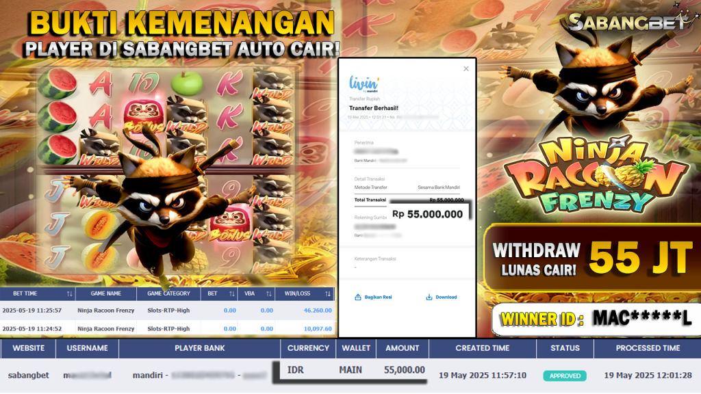 BUKTI KEMENANGAN 19 MEI 2025 DI GAME NINJA RACOON FRENZY ‘PG SOFT’ WD 55 JUTA