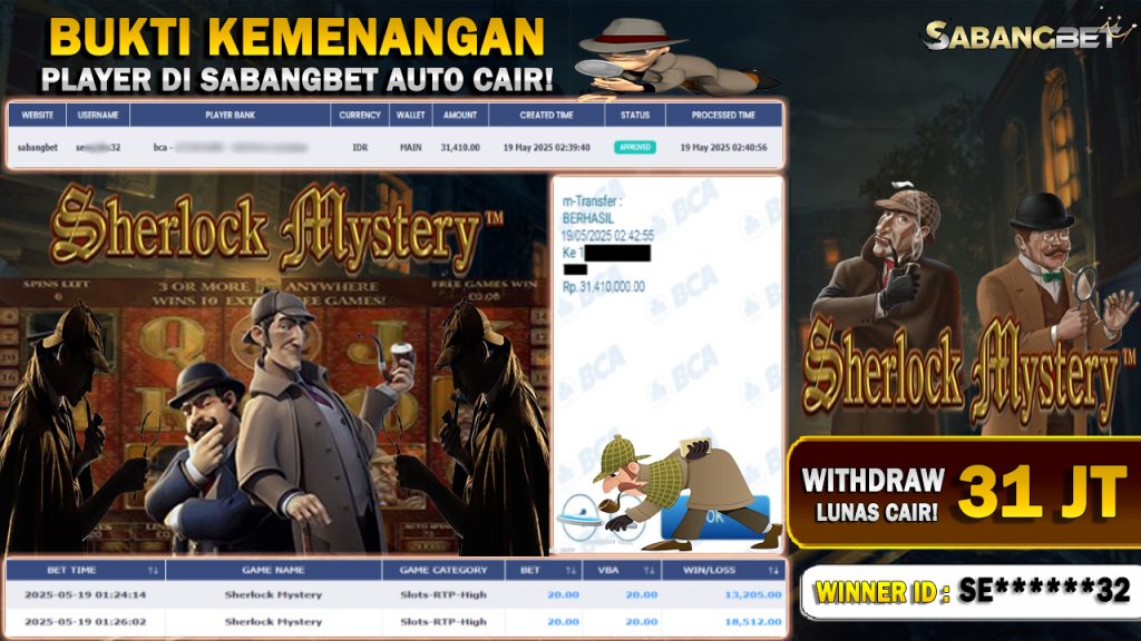 BUKTI KEMENANGAN 19 MEI 2025 DI GAME SHERLOCK MYSTERY WD 31 JUTA