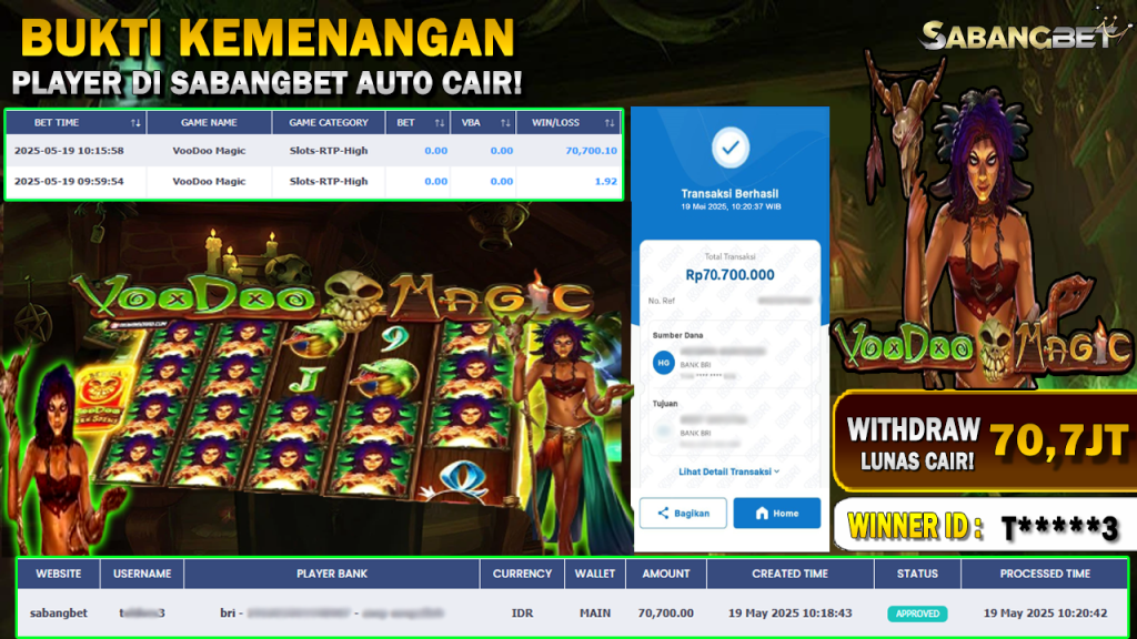BUKTI KEMENANGAN 19 MEI 2025 DI GAME VOO DOO MAGIC WD 70 ,7 JT