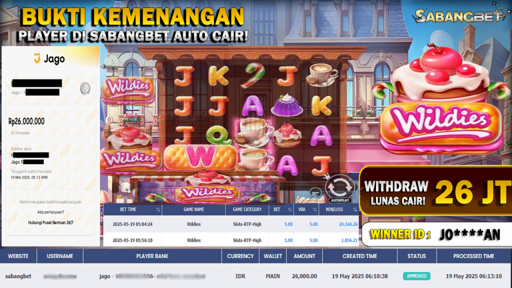 BUKTI KEMENANGAN 19 MEI 2025 DI GAME WILDIES WD 26 JT