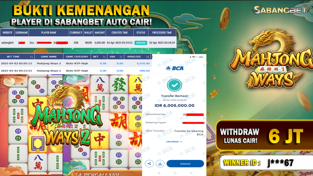 BUKTI KEMENANGAN 2 APRIL 2025 DI GAME MAHJONG WAYS 2 WD 6 JUTA