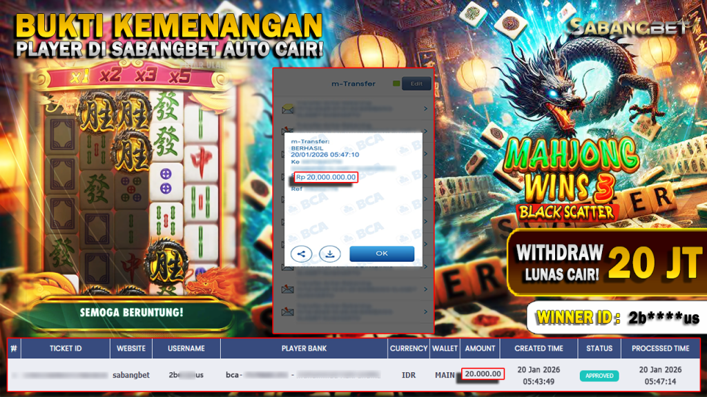 BUKTI KEMENANGAN 20 JANUARI 2026 DI Game Mahjong Wins 3 WD 20 JUTA