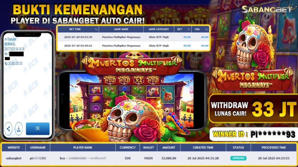 BUKTI KEMENANGAN 20 JULI 2025 DI GAME MUERTOS MULTIPLIER MEGAWAYS WD 33 JUTA