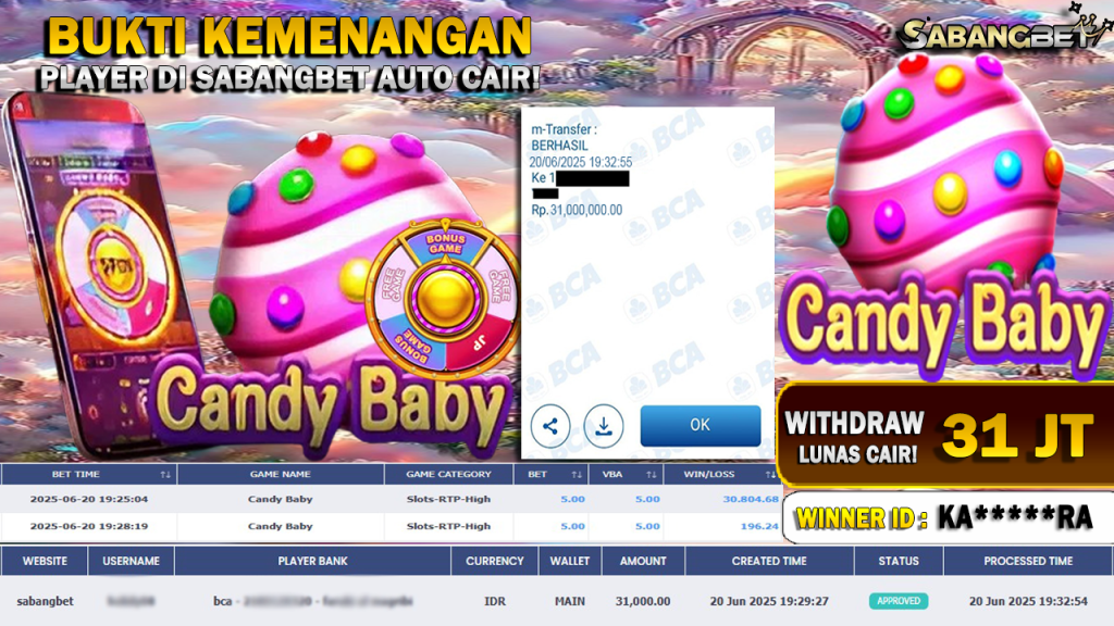BUKTI KEMENANGAN 20 JUNI 2025 DI GAME CANDY BABY WD 31 JUTA
