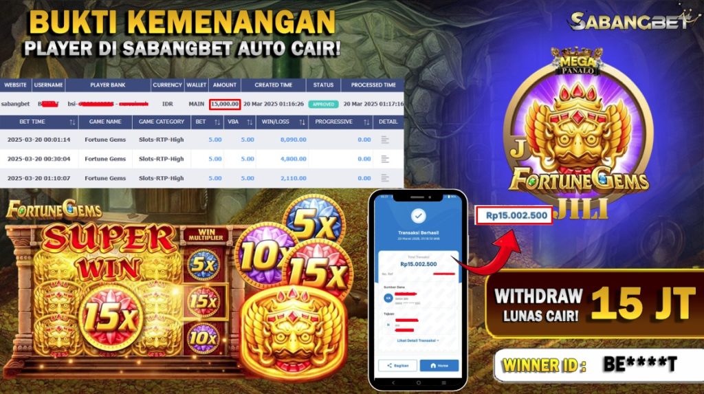 BUKTI KEMENANGAN 20 MARET 2025 DI GAME FORTUNE GEMS WD 15 JT