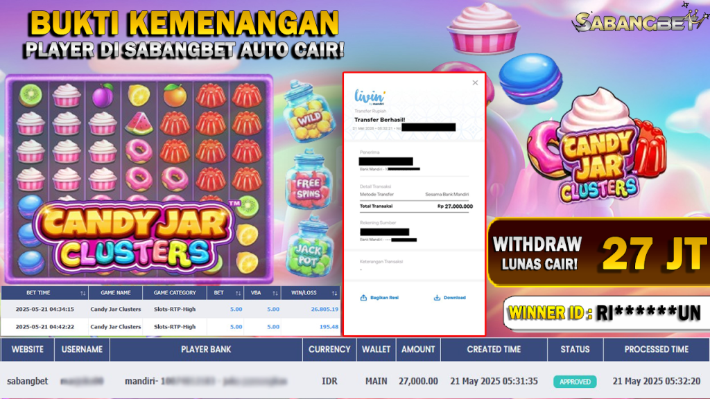 BUKTI KEMENANGAN 21 MEI 2025 DI GAME CANDY JAR CLUSTERS WD 27 JUTA