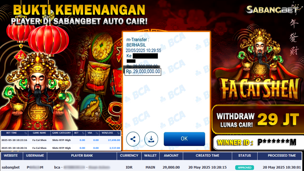BUKTI KEMENANGAN 20 MEI 2025 DI GAME FA CAI SHEN WD 29 JUTA