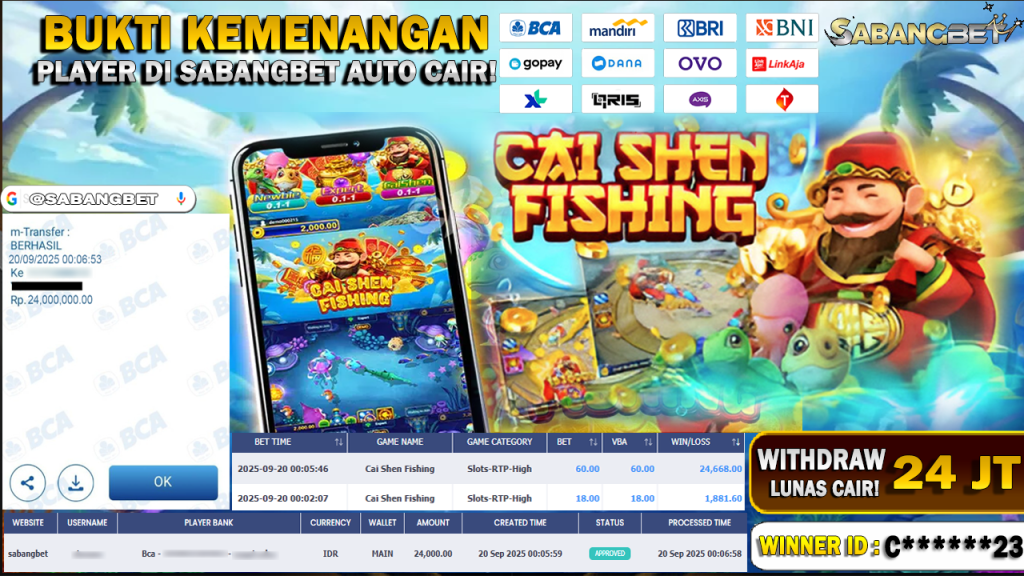 BUKTI KEMENANGAN 20 SEPTEMBER 2025 DI GAME CAI SHEN FISHING WD 24 JUTA