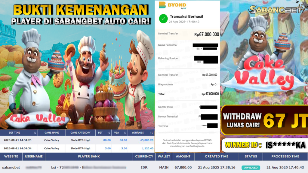 BUKTI KEMENANGAN 21 AGUSTUS 2025 DI GAME CAKE VALLEY WD 67 JUTA