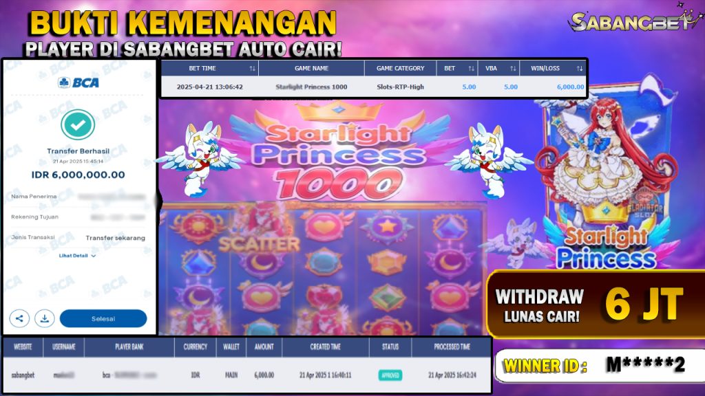 BUKTI KEMENANGAN 21 APRIL 2025 DI GAME STARLIGHT PRINCESS WD 6 JT