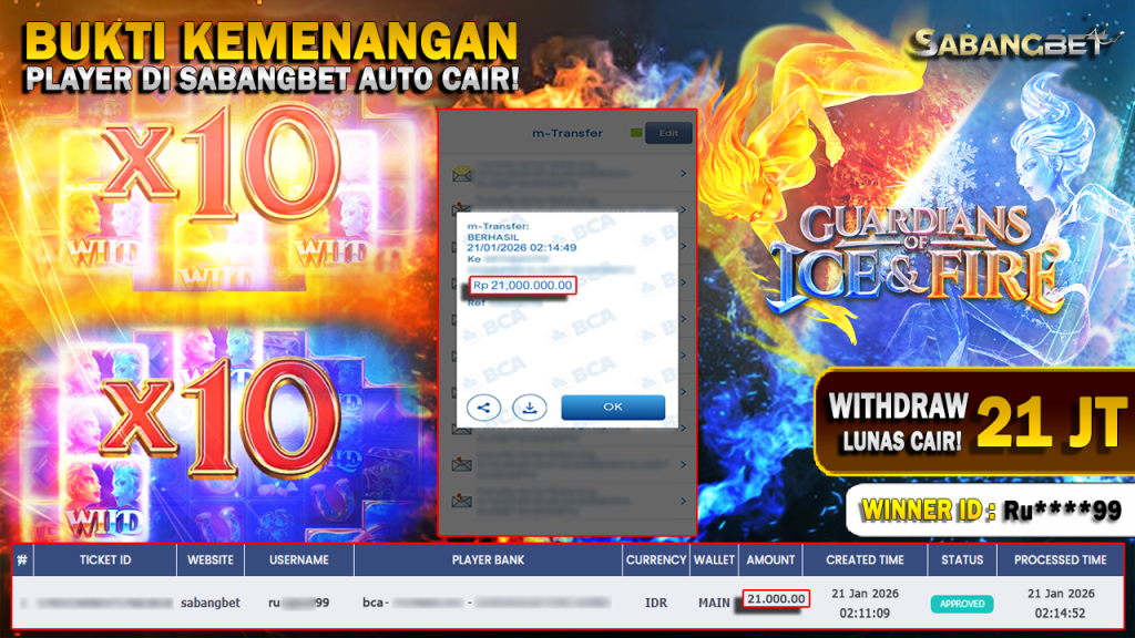 BUKTI KEMENANGAN 21 JANUARI 2026 DI GAME Guardians Ice & Fire WD 21 JUTA