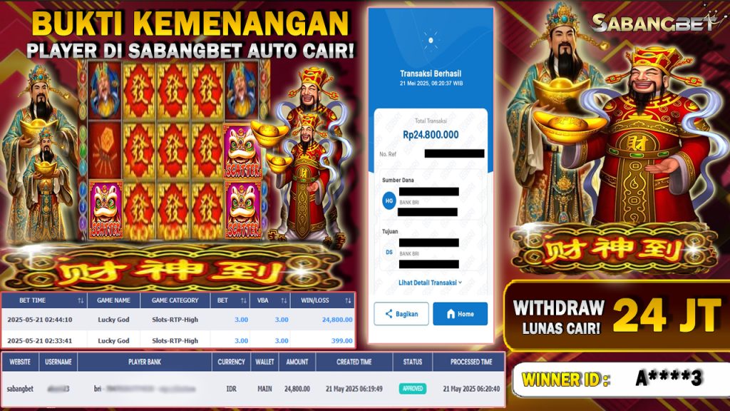 BUKTI KEMENANGAN 21 MEI 2025 DI GAME LUCKY GOD WD 24 JUTA