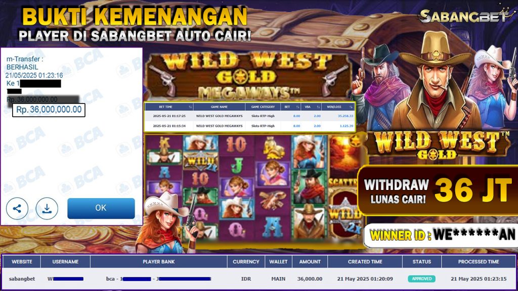 BUKTI KEMENANGAN 21 MEI 2025 DI GAME WILD WEST GOLD MEGAWAYS WD 36 JUTA