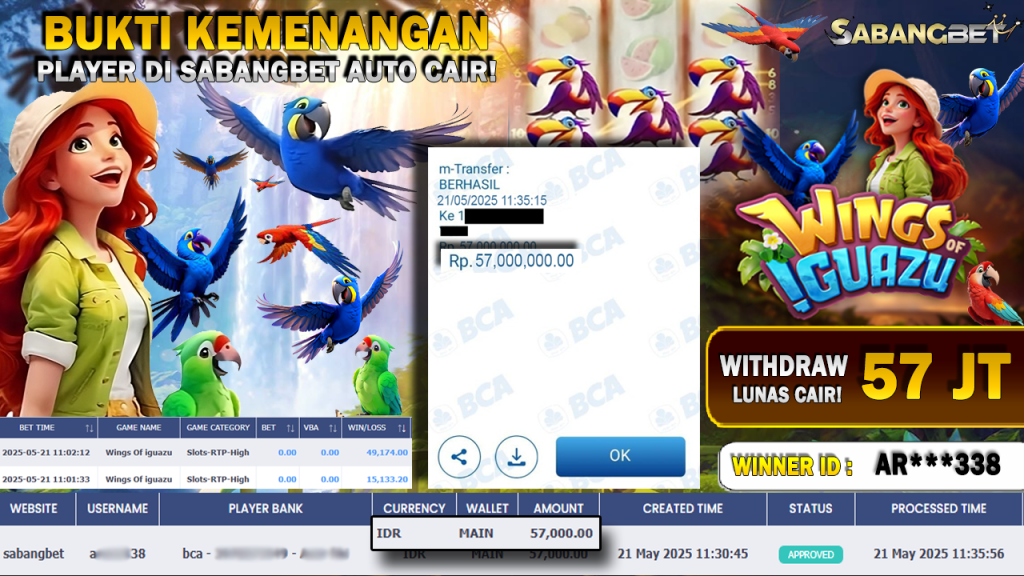 BUKTI KEMENANGAN 21 MEI 2025 DI GAME WING OF IGUAZU ‘PG SOFT’ WD 57 JUTA