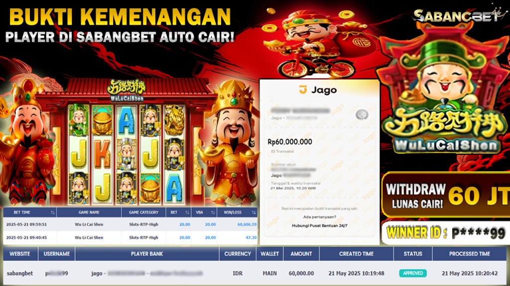 BUKTI KEMENANGAN 21 MEI 2025 DI GAME WU LU CAI SHEN WD 60 JUTA