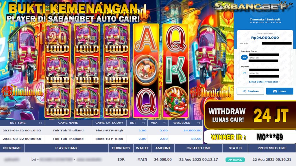 BUKTI KEMENANGAN 22 AGUSTUS 2025 DI GAME Tuk Tuk Thailand WD 24 JUTA