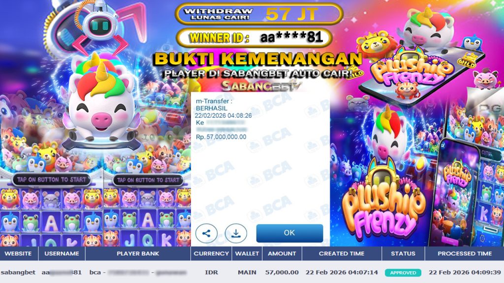 BUKTI KEMENANGAN 22 FEBRUARI 2026 DI GAME PLUSHIE FRENZY WD 57 JUTA