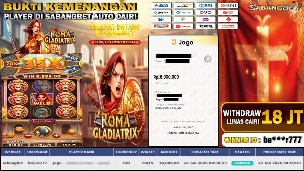 BUKTI KEMENANGAN 22 JANUARI 2026 DI GAME ROMA GLADIATRIX WD 18 JUTA
