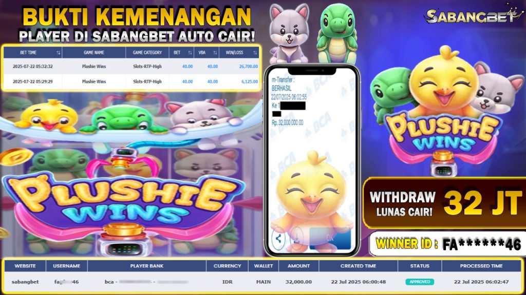 BUKTI KEMENANGAN 22 JULI 2025 DI GAME PLUSHIE WINS WD 32 JUTA