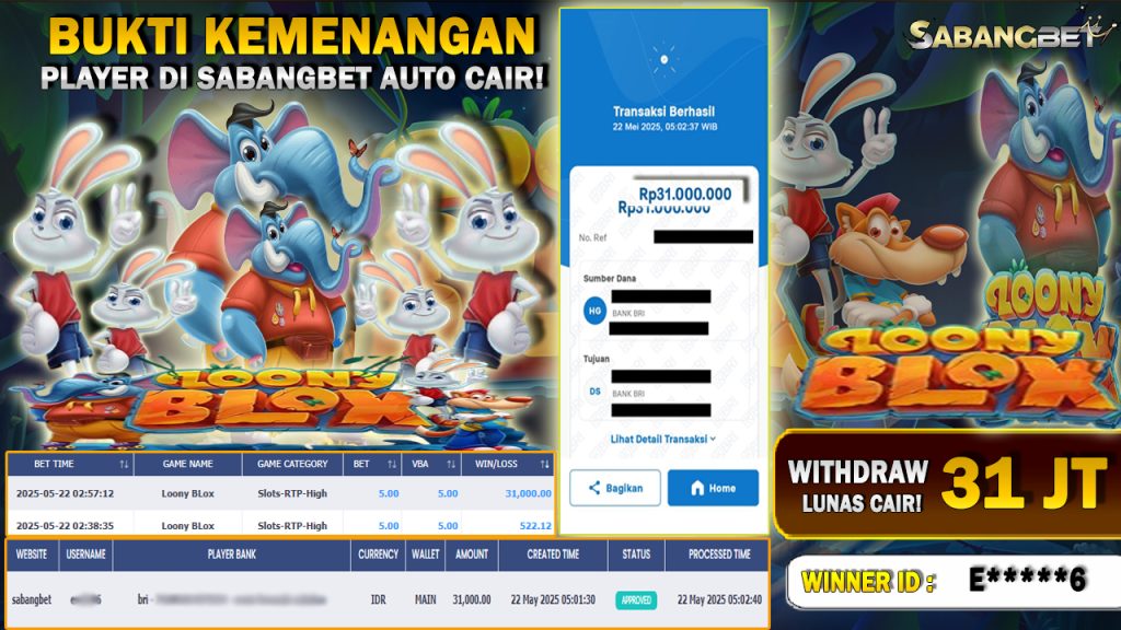 BUKTI KEMENANGAN 22 MEI 2025 DI GAME LOONY BLOX WD 31 JUTA