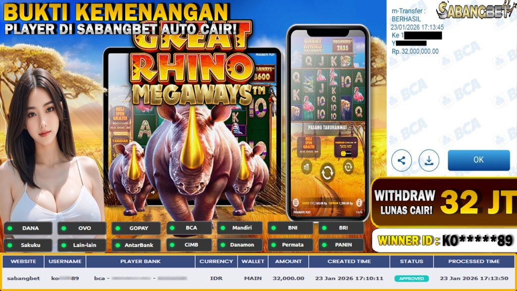 BUKTI KEMENANGAN 23 JANUARI 2026 DI GAME GREAT RHINO MEGAWAYS WD 32 JUTA