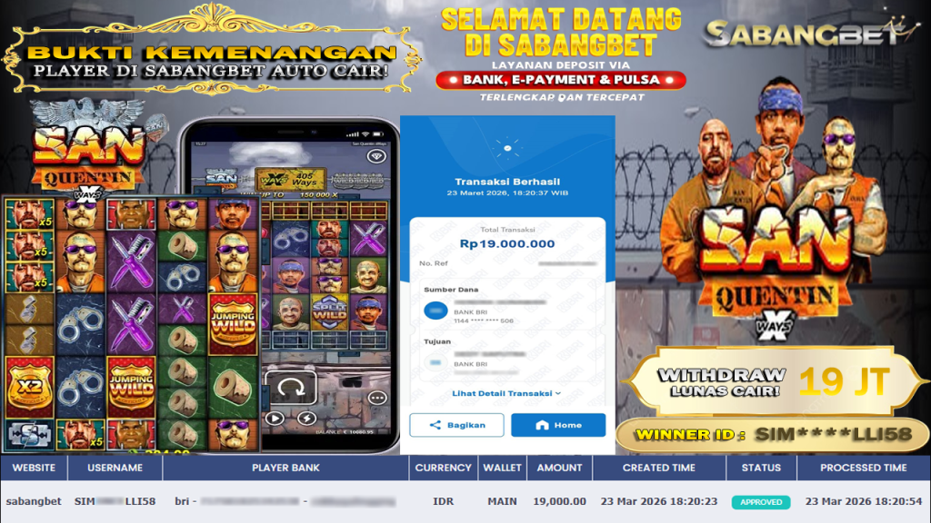 BUKTI KEMENANGAN 23 MARET 2026 DI GAME SAN QUENTIN XWAYS WD 19 JUTA