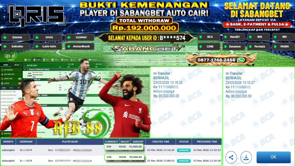BUKTI KEMENANGAN 23 MARET 2026 DI GAME SPORTSBOOK AFB 88 WD 192 JUTA