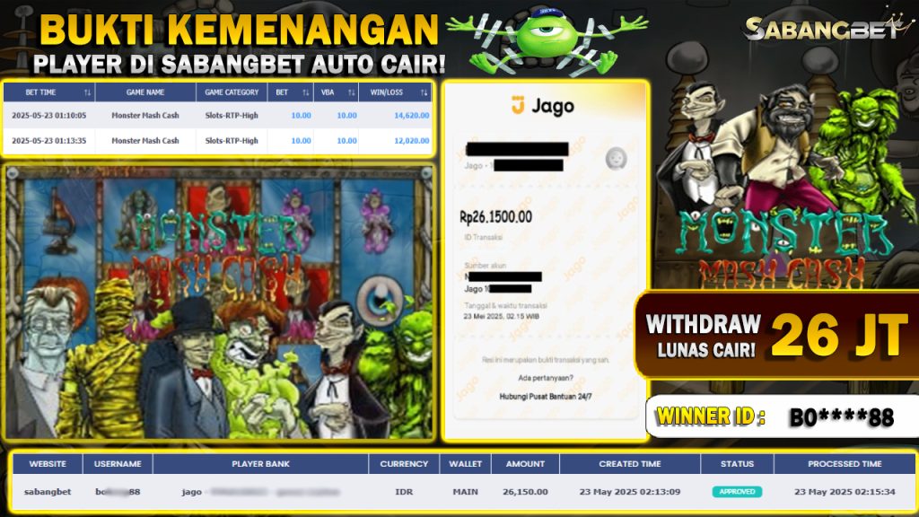 BUKTI KEMENANGAN 23 MEI 2025 DI GAME MONSTER MASH CASH WD 26 JUTA