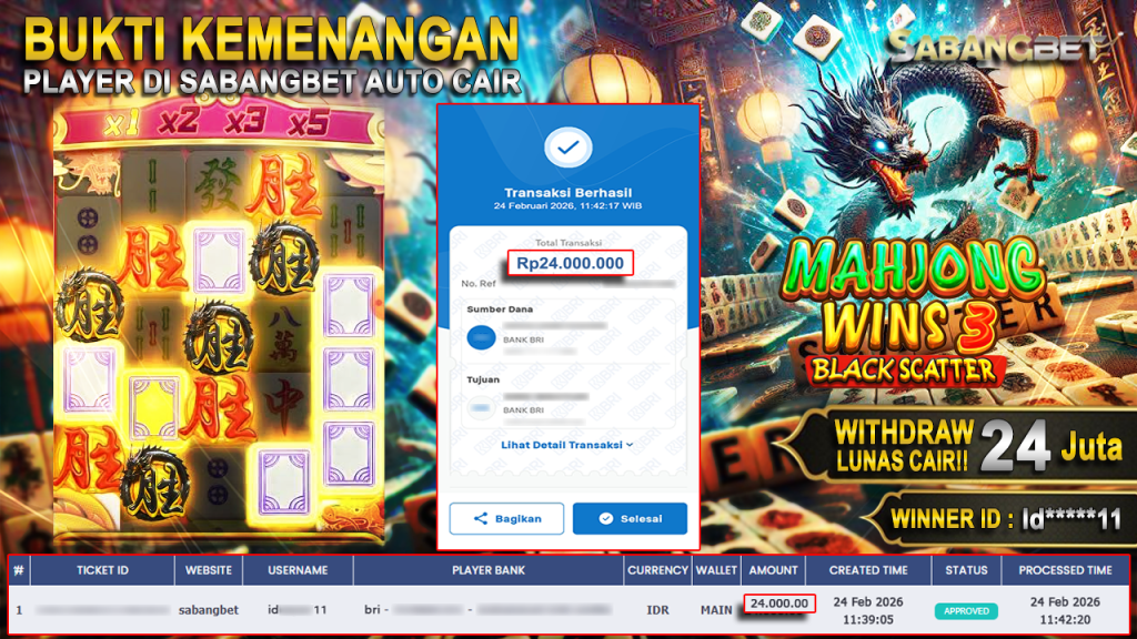 BUKTI KEMENANGAN 24 FEBRUARI 2026 DI GAME Mahjong Wins 3 Black Scatter WD 24 JUTA