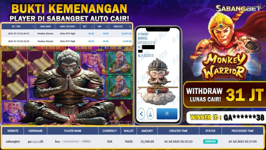 BUKTI KEMENANGAN 24 JULI 2025 DI GAME MONKEY WARRIOR WD 31,5 JUTA