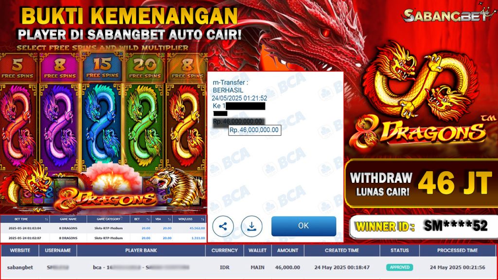 BUKTI KEMENANGAN 24 MEI 2025 DI GAME 8 DRAGONS PRAGMATIC PLAY WD 46 JUTA