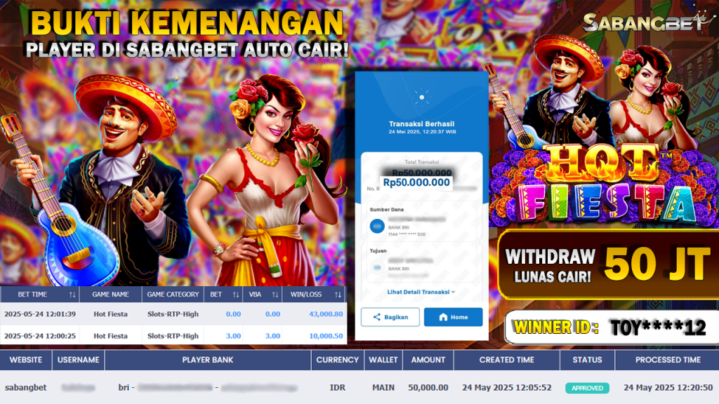 BUKTI KEMENANGAN 24 MEI 2025 DI GAME HOT FIESTA ‘PRAGMATIC PLAY’ WD 50 JUTA