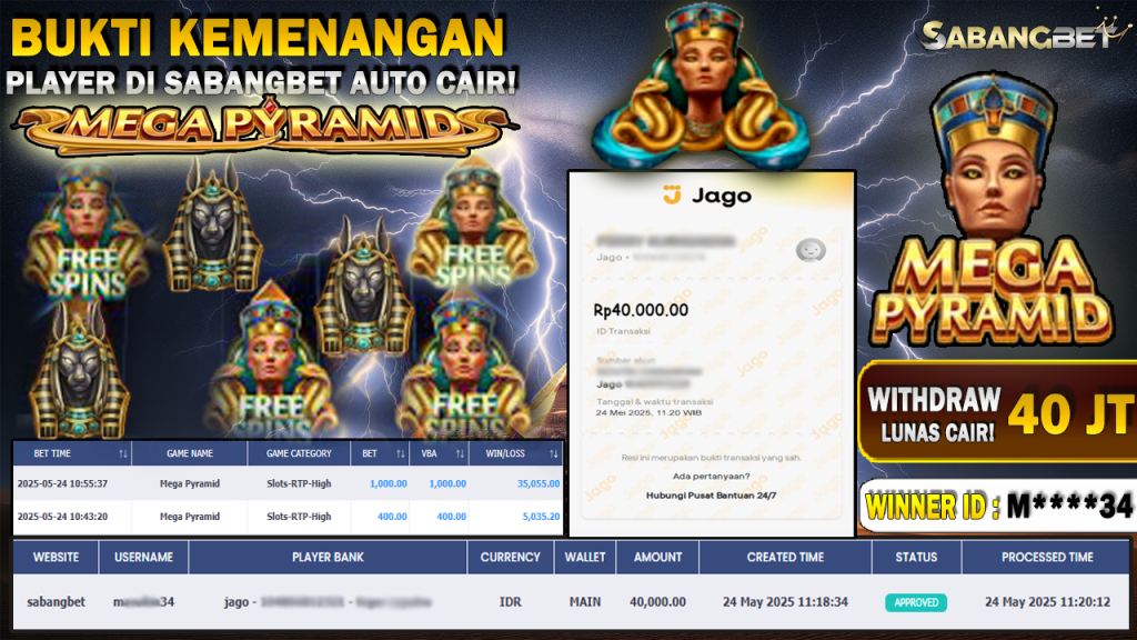 BUKTI KEMENANGAN 24 MEI 2025 DI GAME MEGA PYRAMIDS WD 40 JUTA