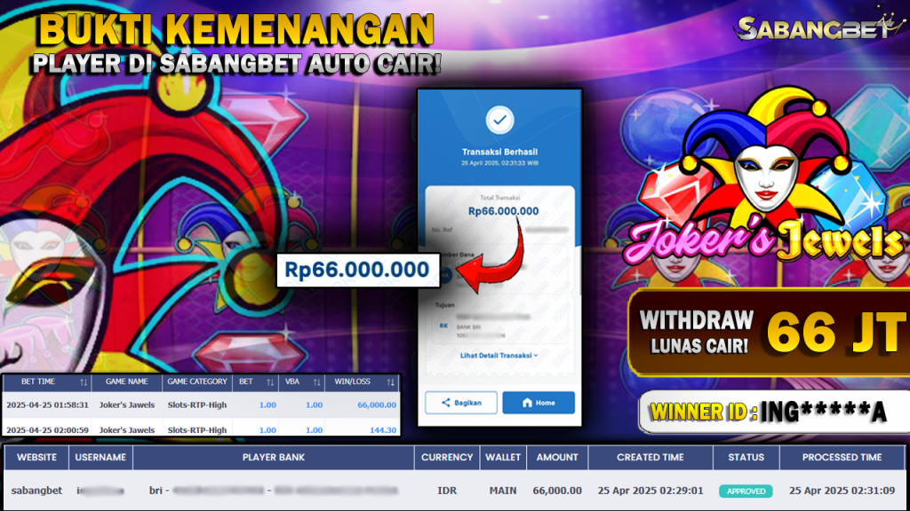 BUKTI KEMENANGAN 25 APRIL 2025 DI GAME JOKER’S JAWELS WD 66 JUTA
