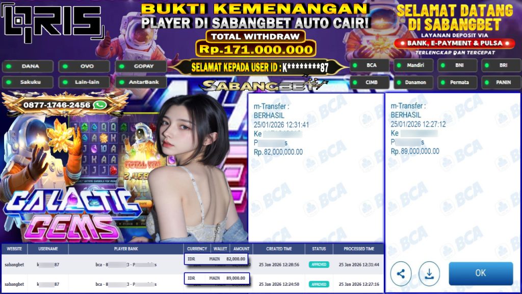 BUKTI KEMENANGAN 25 JANUARI 2026 DI GAME GALACTIC GEMS WD 171 JUTA
