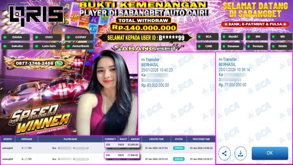 BUKTI KEMENANGAN 25 JANUARI 2026 DI GAME SPEED WINNER WD 140 JUTA