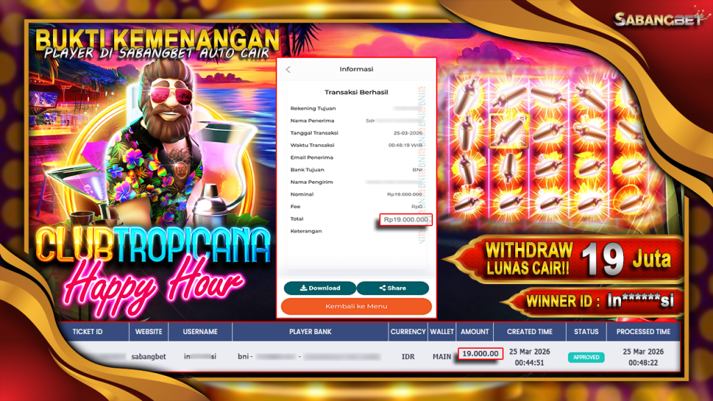 BUKTI KEMENANGAN 25 MARET 2026 DI GAME Club Tropicana Happy hour WD 19 JUTA