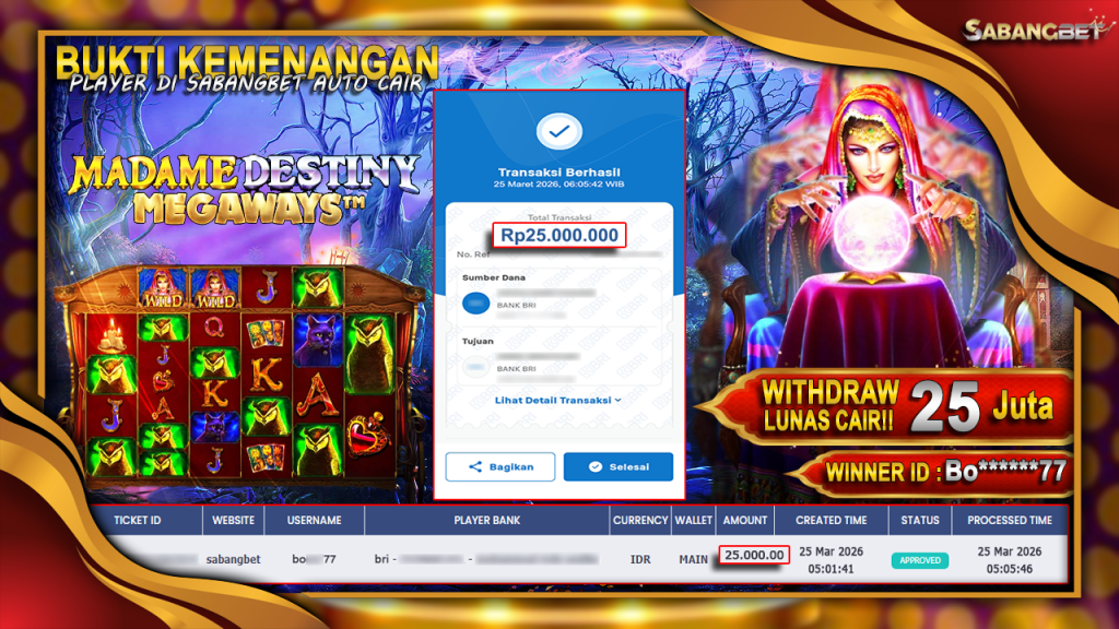 BUKTI KEMENANGAN 25 MARET 2026 DI GAME Madame Destiny Megaways WD 25 JUTA