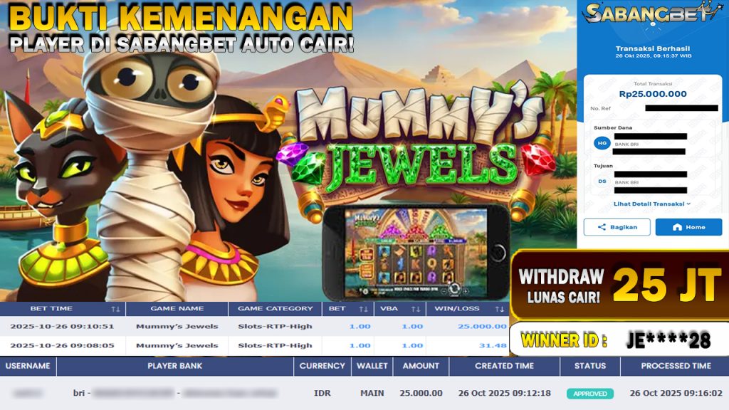 BUKTI KEMENANGAN 26 OKTOBER 2025 DI GAME Mummy’s Jewels WD 25 JUTA