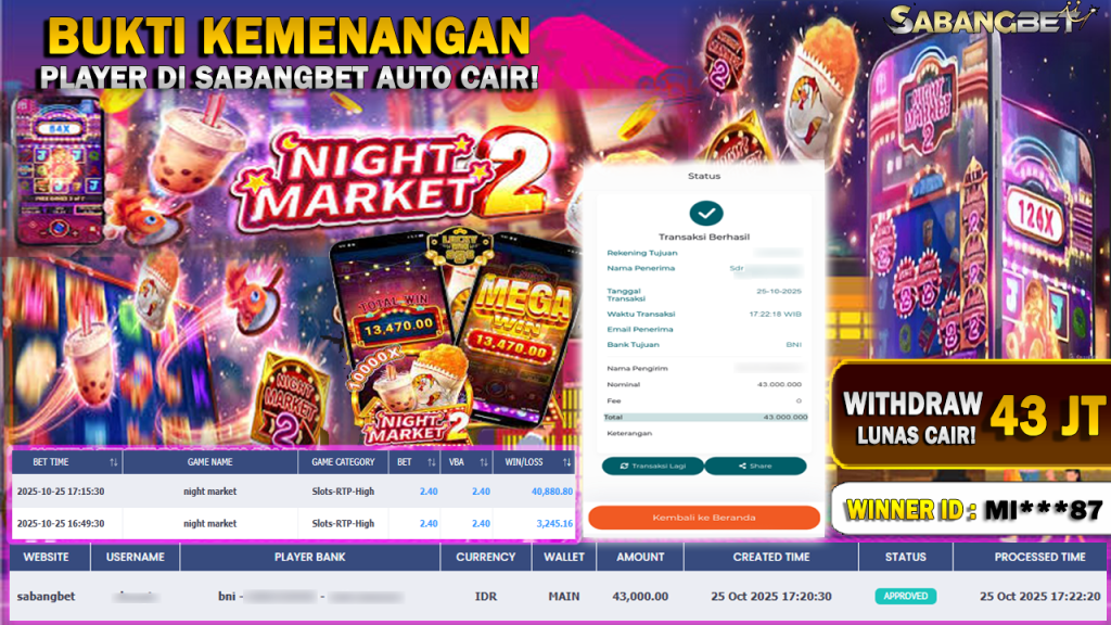 BUKTI KEMENANGAN 25 OKTOBER 2025 DI GAME NIGHT MARKET ( FA CAI ) WD 43 JUTA
