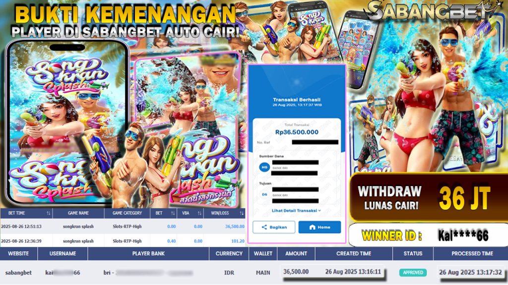 BUKTI KEMENANGAN 26 AGUSTUS 2025 DI GAME SONGKRAN SPLASH WD 36 JUTA