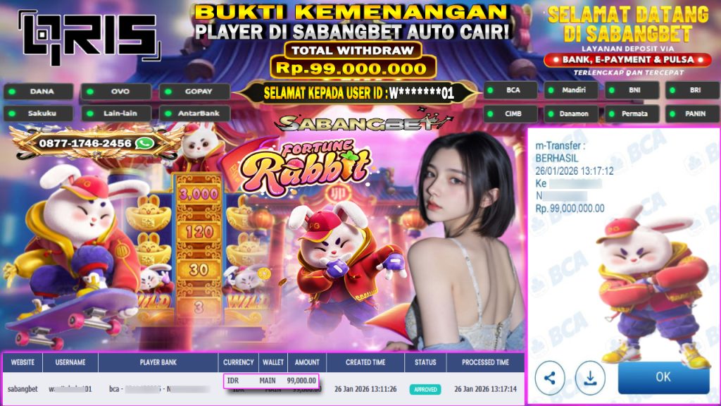 BUKTI KEMENANGAN 26 JANUARI 2026 DI GAME FORTUNE RABBIT WD 99 JUTA