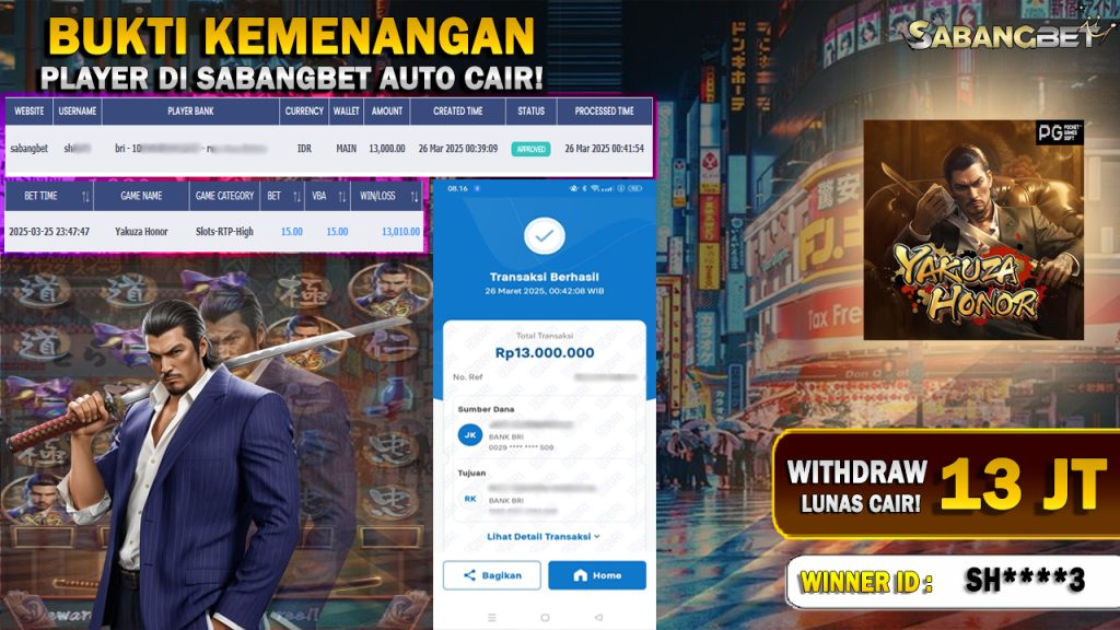 BUKTI KEMENANGAN 26 MARET 2025 DI GAME YAKUZA HONOR WD 13 JUTA