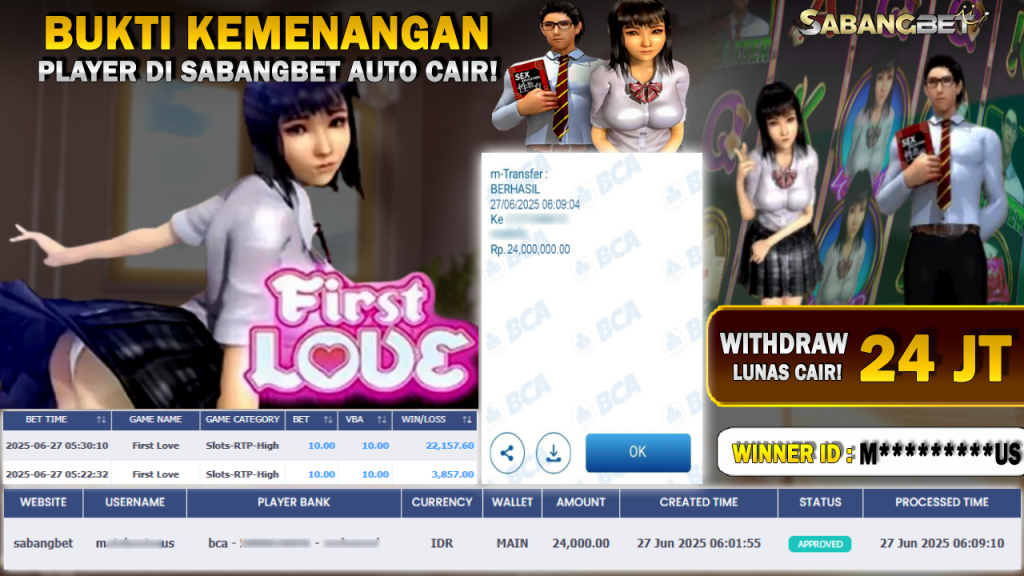 BUKTI KEMENANGAN 27 JUNI 2025 DI GAME FIRST LOVE WD 24 JUTA