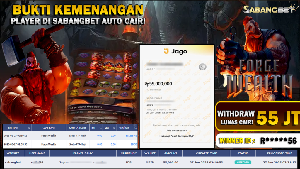 BUKTI KEMENANGAN 27 JUNI 2025 DI GAME FORGE WEALTH WD “PG SOFT” 55 JUTA