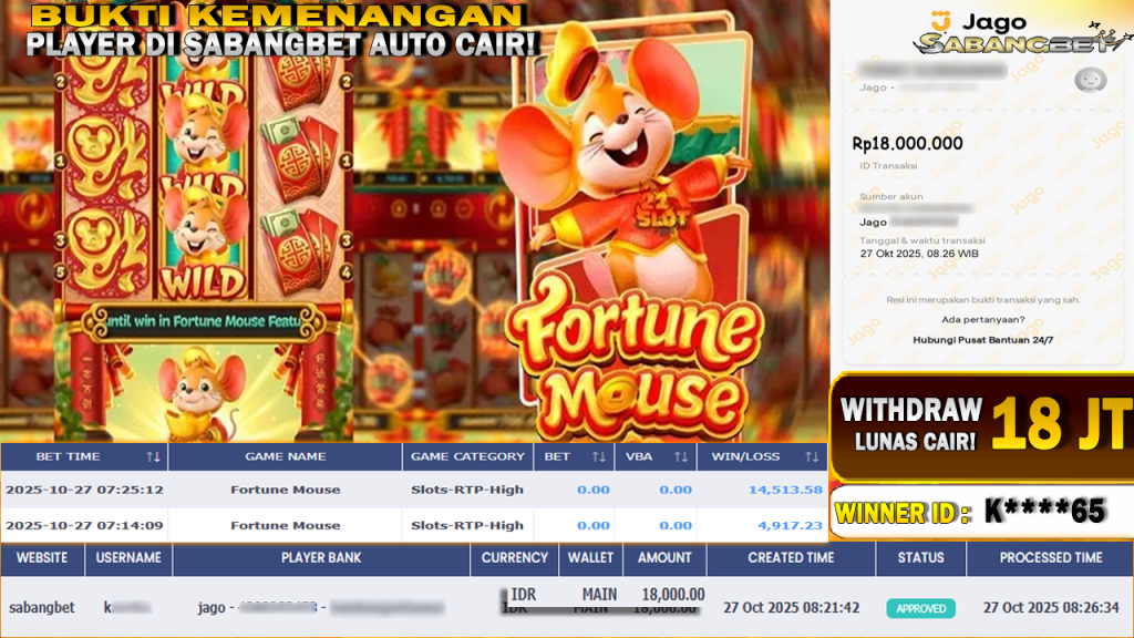 BUKTI KEMENANGAN 27 OKTOBER 2025 DI GAME FORTUNE MOUSE WD 18 JUTA