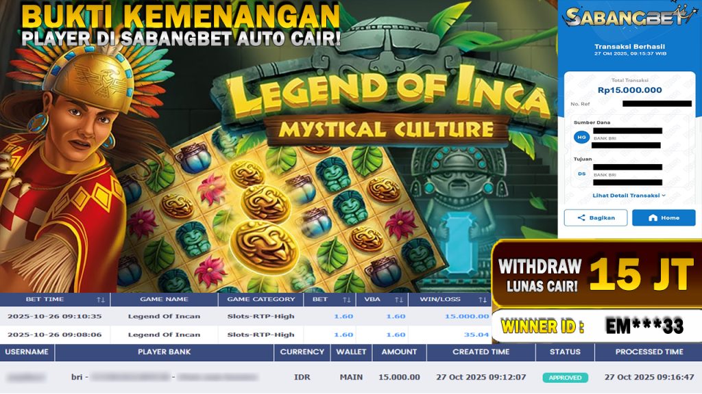 BUKTI KEMENANGAN 27 OKTOBER 2025 DI GAME Legend Of Incan WD 15 JUTA