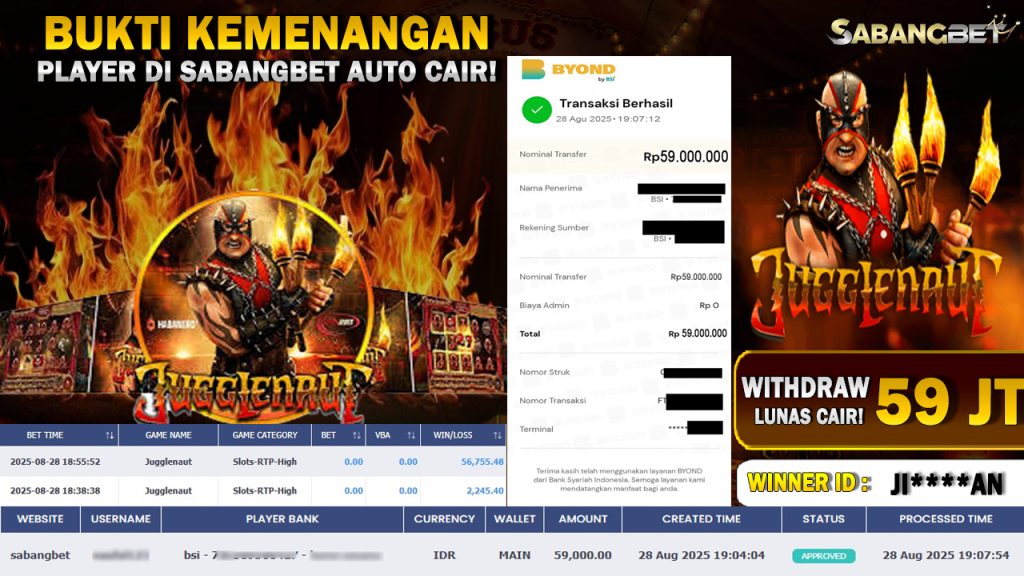 BUKTI KEMENANGAN 28 AGUSTUS 2025 DI GAME JUGGLENAUT WD 59 JUTA