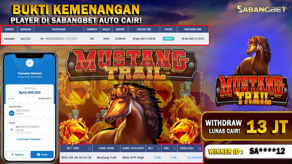BUKTI KEMENANGAN 28 APRIL 2025 DI GAME WILD MUSTANG TRAIL WD 13 JUTA