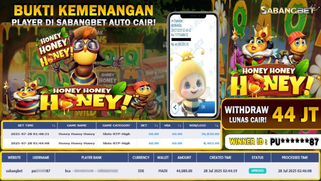 BUKTI KEMENANGAN 28 JULI 2025 DI GAME HONEY HONEY HONEY WD 44 JUTA